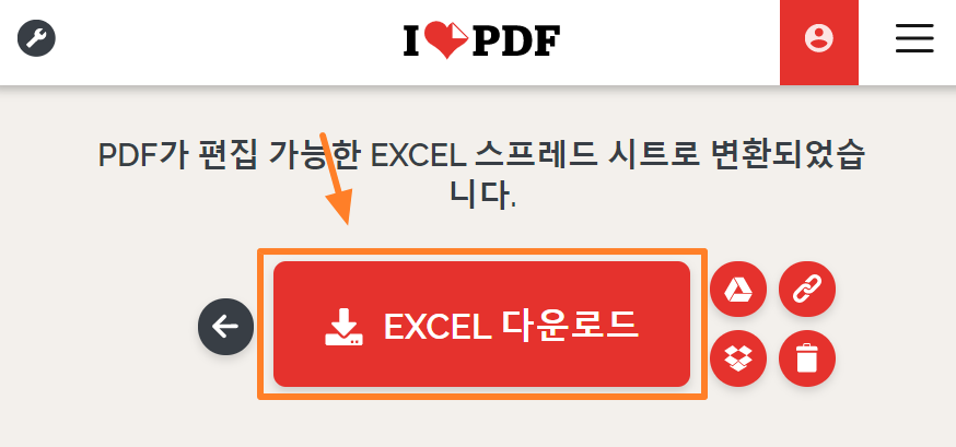 일정 시간을 기다리고 나면 PDF파일이 엑셀파일로 변환이 되어 다운로드를 받을 수 있는 메뉴가 생기게 되는데요!