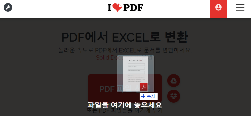 좌측의 PDF파일을 우측에 드래그하고 PDF파일 엑셀파일로 변환될 때 까지 잠시만 기다려주도록 하겠습니다. 시간이 조금 필요합니다.