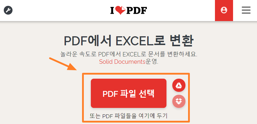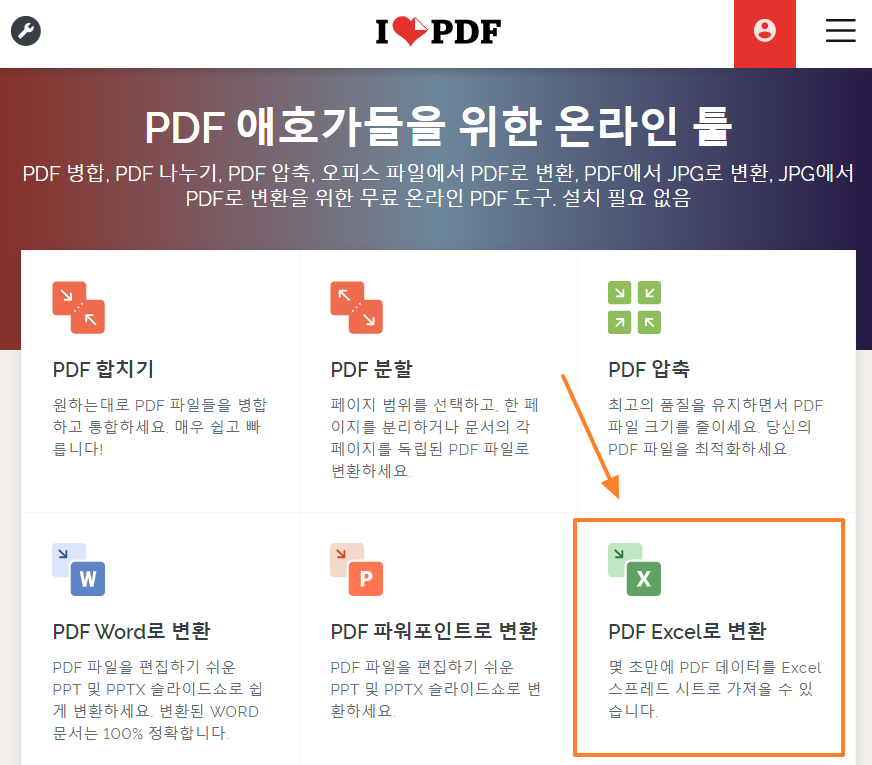 마지막으로 알아볼 방법은 I♥PDF라는 홈페이지를 활용한 방법인데요! I♥PDF를 활용하여 PDF파일 엑셀파일로 변환하는 방법도 어렵지 않습니다. SmallPDF에서 살펴보았던 방법과 거의 유사합니다.