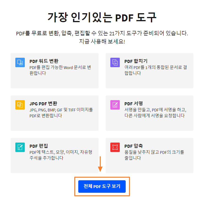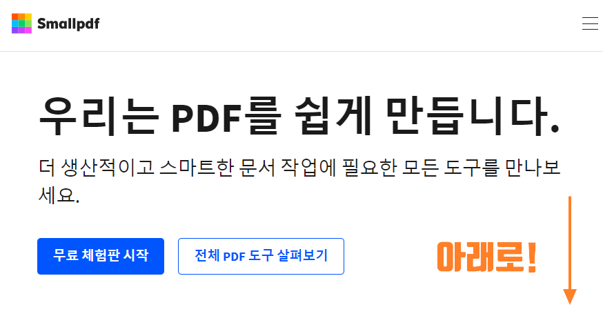 들어가게 되면 홈페이지 전면이 나오는데, 홈페이지를 아래로 내리시면 SmallPDF의 다양한 기능들이 나오게 됩니다.