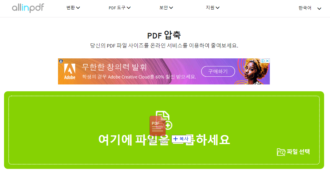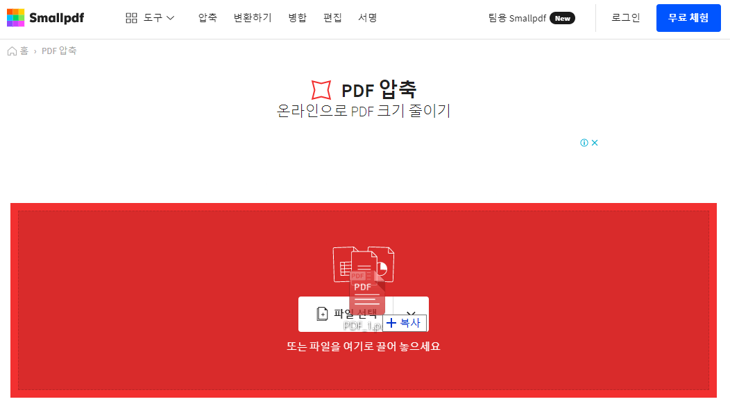 3. 압축하고자하시는 파일을 드래그해주세요! SmallPDF와 동일한 방법이라 따라오시는데 어려움은 없으실 겁니다!