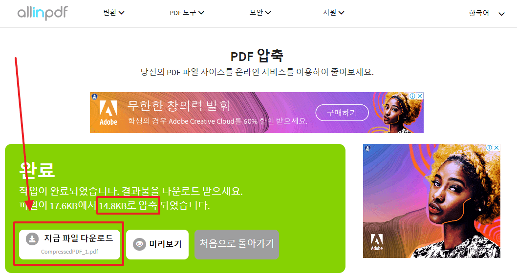 4. 압축된 파일을 다운로드 받아주세요! 기존 17.5KB에서 14.8KB까지 용량이 확 줄어든 것을 알 수 있습니다. 인터페이스가 직관적이라 어렵지 않게 따라오실 수 있으실 거라 생각합니다!