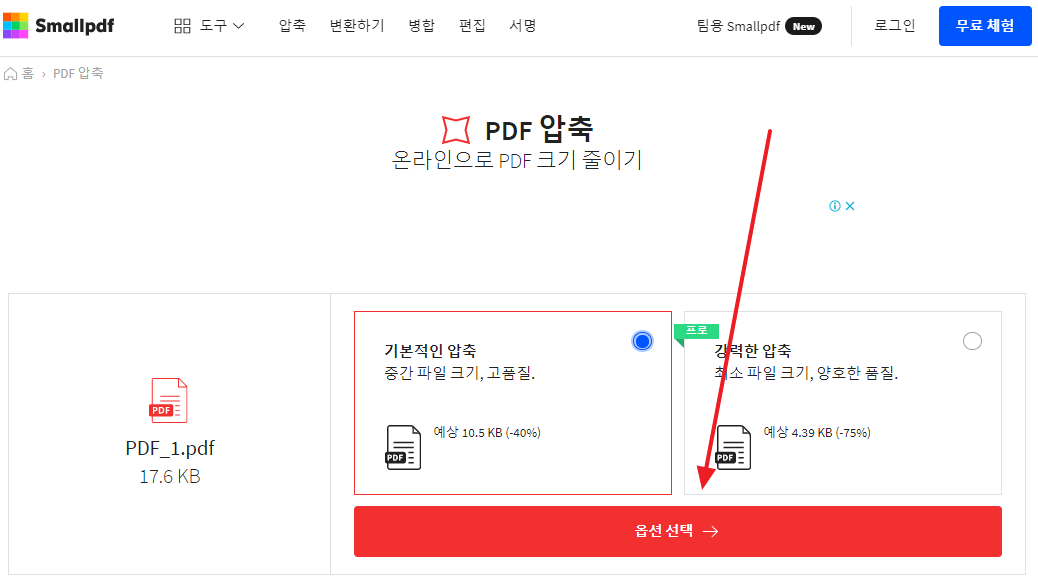 6. 아래 옵션중에 '기본적인 압축'을 클릭하고 옵션선택 버튼을 눌러주세요! 강력한 압축은 용량을 1/3까지 낮출 수 있지만, 유료버전이기 때문에 저희는 기본적인 압축으로 무료로 PDF 파일의 용량을 줄이겠습니다.