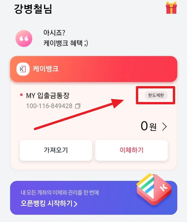 다음은 케이뱅크 이체한도 늘리는 방법인데요! 이체한도는 총 2차례에 걸쳐 일회 이체 한도 최대 1억, 일일 이체한도 최대 1억 5천까지 가능합니다. 마찬가지로 사진과 함께 설명드릴테니 천천히 따라와주세요!👨💻