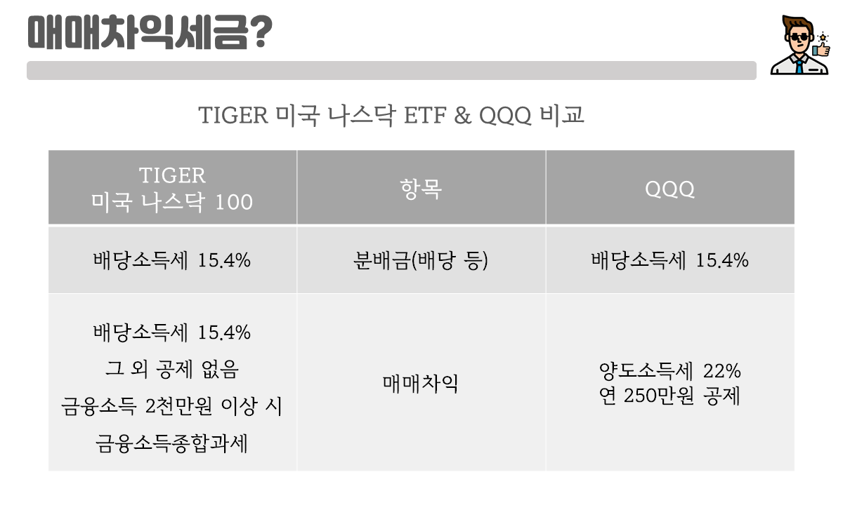 매매차익 세금에 있어 QQQ보다 상대적으로 더 저렴한 것을 알 수 있습니다.