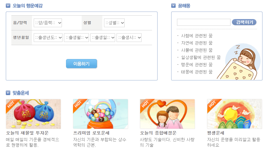 어떤가요? 확실히 인기 운세 메뉴탭들이다보니 평소에 궁금하셨던 내용들이 많지요? 다음은 가볍게 확인하시기 좋은 오늘의 운세와 꿈 해몽인데요!😎