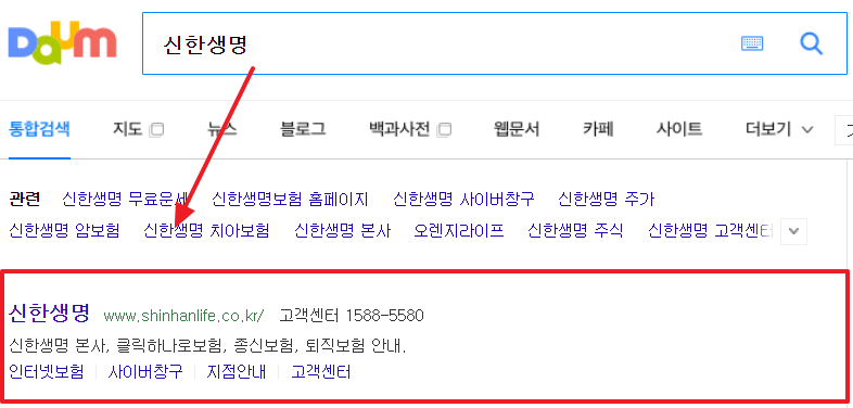 먼저, 다음 검색창에 신한생명을 검색해주세요! 그럼 신한생명 홈페이지가 가장 상단에 위치하고 있는데요! 아래 사진에서처럼 신한생명 홈페이지를 눌러 들어가보겠습니다.😊