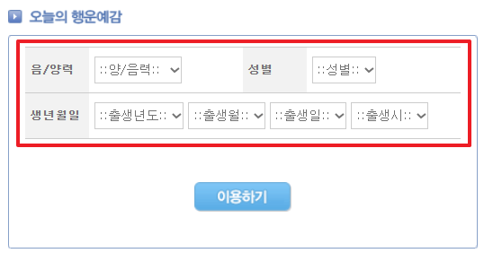 먼저 오늘의 운세를 확인하시는 방법은 운세/사주 메뉴에서 아래로 내리다보시면 준비되어있는 '오늘의 행운예감' 메뉴를 활용하시면 되겠습니다. 내 생일의 음/양력 여부, 성별, 생년월일, 출생시간 등을 미리 준비하신뒤에 아래 입력란에 입력해주세요!🙌