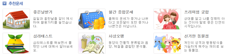 운세/사주 메뉴를 누르시면 아래와 같이 정통운세로부터, 생활운세, 애정/궁합, 퓨전/꿈해몽, 사상오행 성향분석까지 확인할 수 있는 각종 유용한 운세 분석 메뉴들이 나와있는데요!😃