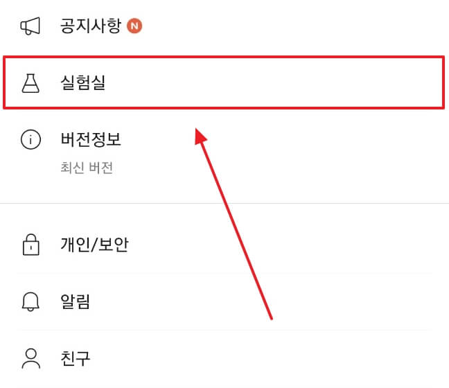 ✅ 그럼 공지사항, 버전정보, 개인/보안, 알림, 친구 등 다양한 메뉴가 나오는데요! 설정할 수 있는 메뉴들 가운데 사진과 같이 실험실에 들어가주세요!😎