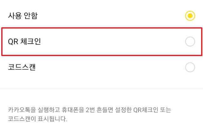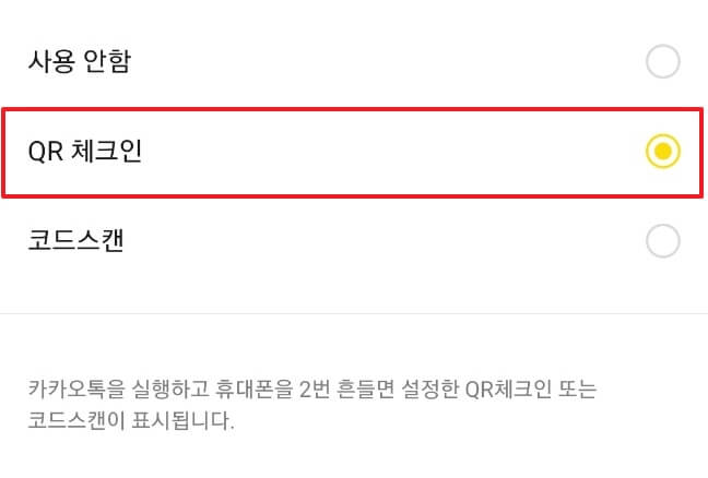 ✅ 아래 사진과 같이 QR체크인을 체크해주시면 쉐이크기능으로 QR체크인을 설정함으로써 카톡 QR코드 흔들기 기능이 활성화됩니다! 어렵지 않죠?👨💻