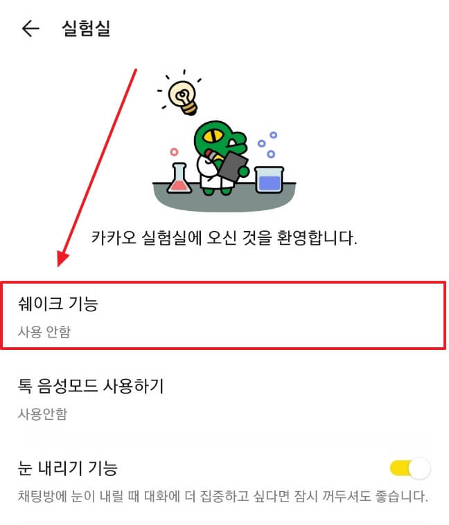 ✅ 실험실에 보시면 쉐이크 기능을 포함해 톡 음성모드 사용하기, 눈 내리기 기능 등 다양한 신규 기능이 준비되어 있는데요! 그 중에서 쉐이크 기능을 선택하도록 해주세요!👌