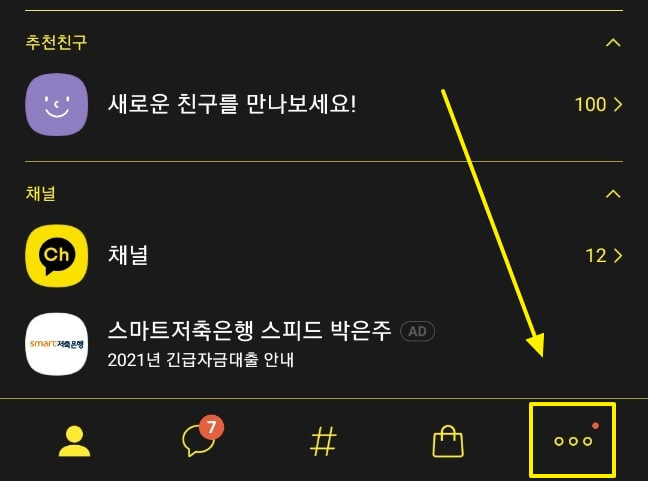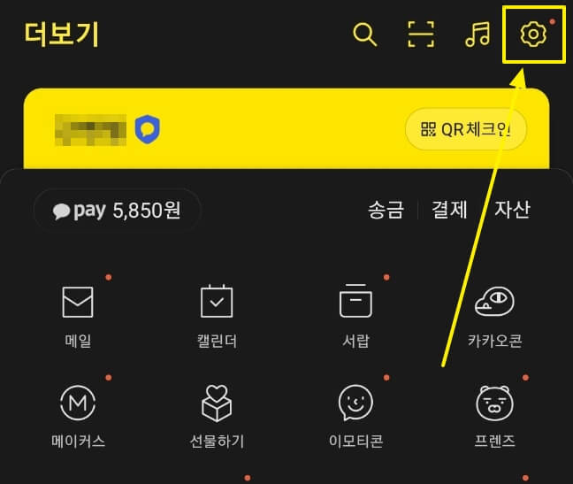 ✅ 먼저, 카카오톡을 켠 뒤 하단부에 점 세개(▪ ▪ ▪)를 누르시고 우측 상단의 톱니바퀴(⚙) 버튼을 눌러주세요!😃