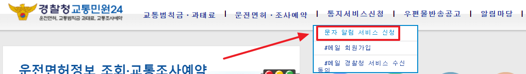 ✅ 그 다음은 통지서비스신청의 하위 메뉴인 문자 알림 서비스 신청 버튼을 눌러주시면 되는데요! 아래 #메일 회원가입 #메일 경찰청 서비스수신 동의 등의 서비스는 무시하시고 바로 문자 알림 서비스 신청 버튼을 눌러주시면 됩니다.