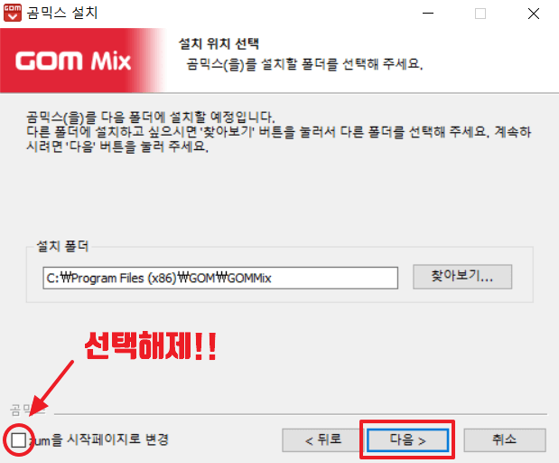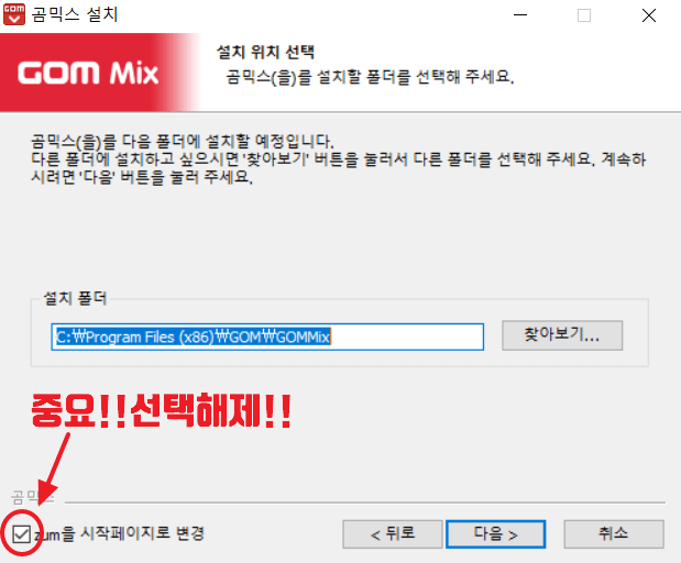 ✅ 다음은 설치폴더 지정화면이 나오는데요! 여기서 중요한 포인트가 있습니다. 바로 Zum 시작페이지로 변경을 반드시 해제해줘야하는 것인데요! 아래와 같이 'Zum을 시작페이지로 변경'이 구석에 있어 놓칠 수 있습니다. 반드시 해제해주어 불필요하게 Zum이 시작페이지로 설정되지 않도록 신경써주세요!😀