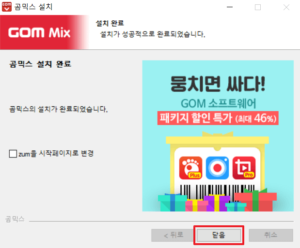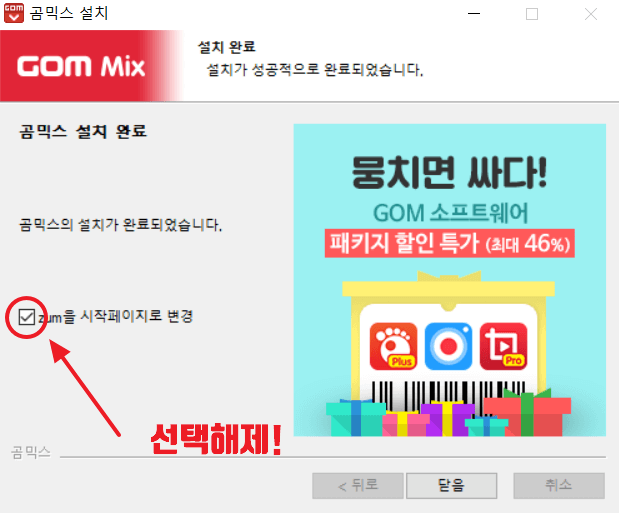 ✅ 마지막으로 아래 사진의 닫음 버튼을 누르면 곰믹스 다운로드 설치가 마무리되는데요! 이전에 반드시 또 'Zum을 시작페이지로 변경'이라는 선택을 반드시 해제해줘야합니다! 꼭 미리 확인하셔서 선택해제해주세요!🤗