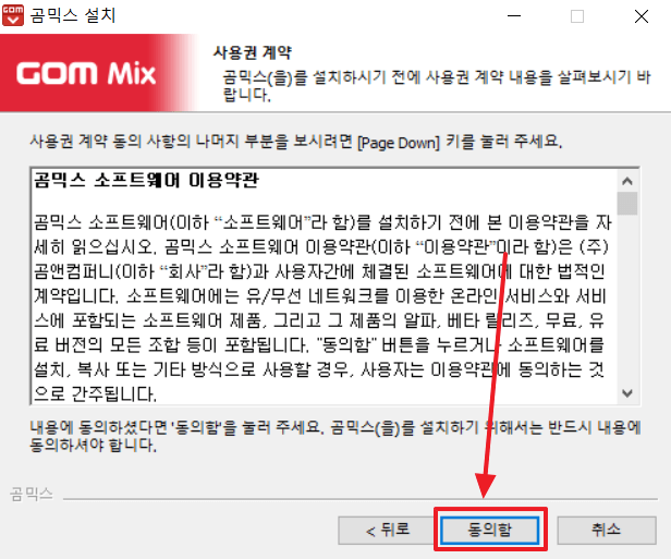 ✅ 곰믹스 설치프로그램이 다운로드가 다 받아지면 아래와 같이 본격적으로 곰믹스 다운로드 설치가 진행되는데요! 차례로 동의함과 다음 버튼을 아래와 같이 눌러주세요!