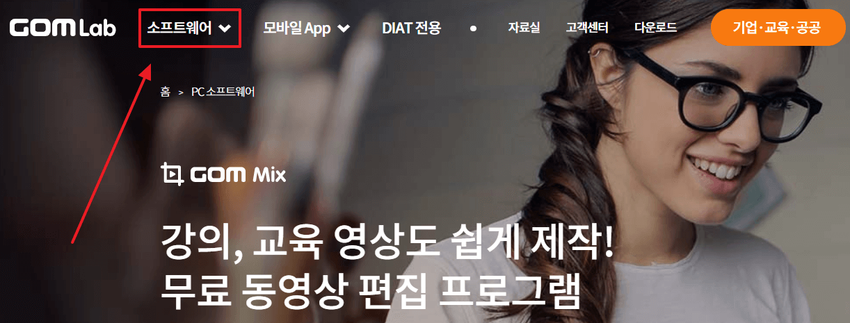 ✅ 그럼 곰랩 메인 홈페이지가 나오는데요! 메인 홈페이지 상단에 준비되어있는 소프트웨어 메뉴 탭을 눌러주신 뒤에 아래 사진처럼 곰믹스 - 곰믹스 메뉴 탭을 눌러주세요!