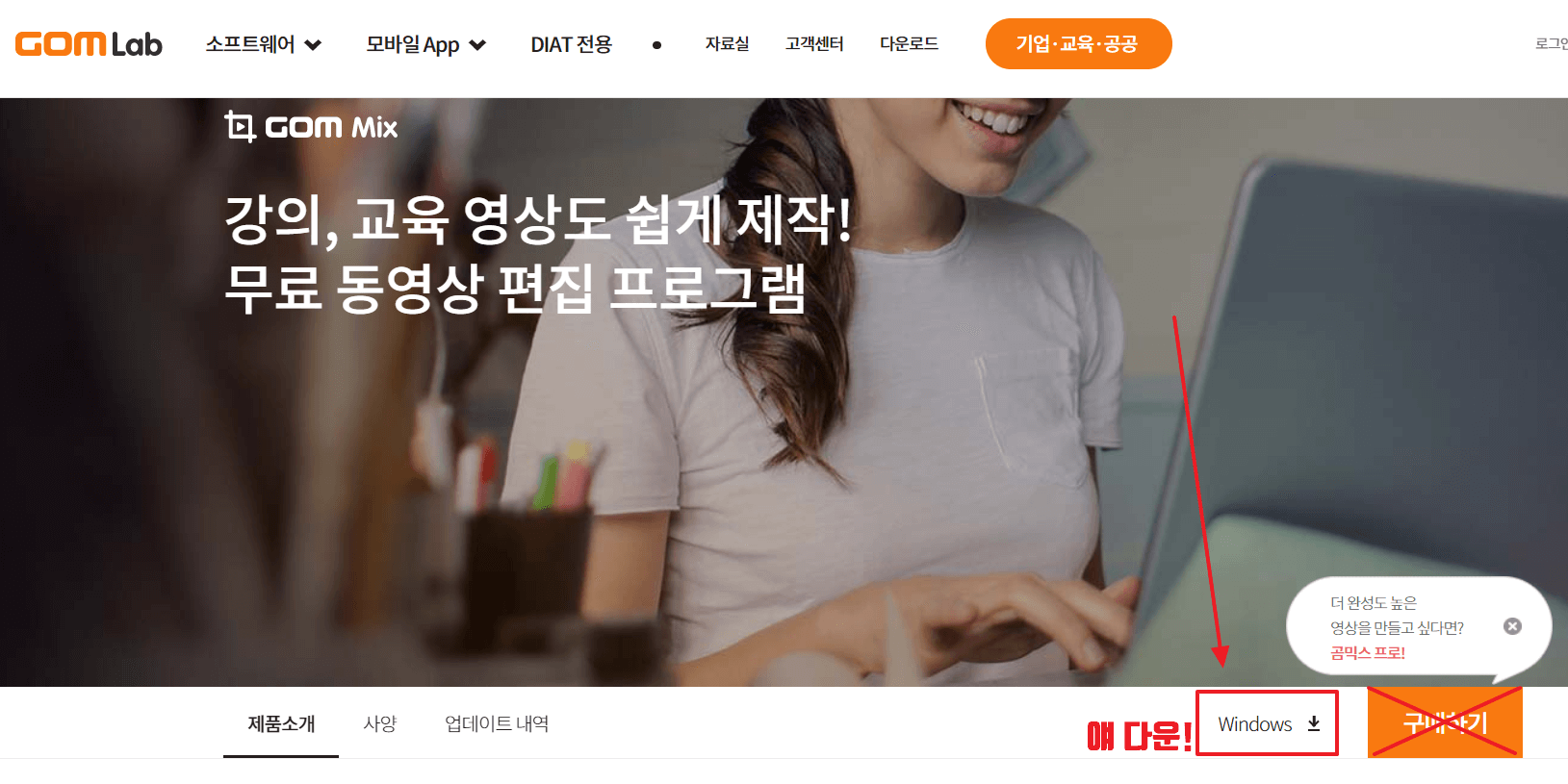 ✅ 그럼 아래와 같이 Windows라는 버튼이 활성화됩니다. 그 우측에 보면 '구매하기'버튼도 있는데요! '구매하기'의 경우 곰믹스 프로 버전, 즉 유료 버전의 곰믹스를 다운로드 받는 것이니 무료 곰믹스 다운로드를 위해서는 꼭 Windows 버튼을 눌러주세요!🙌