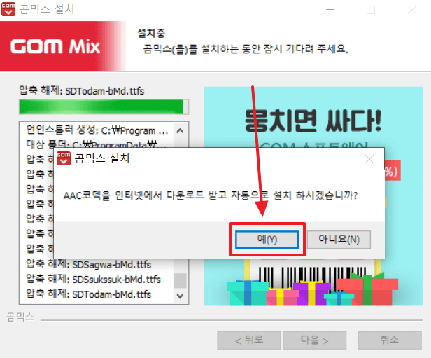 순서대로 AAC코덱, IPP런타임, DTS/AC3코덱, MPEG코덱 등을 묻고 있는데, 모두 '예'버튼을 눌러 넘어가주세요!