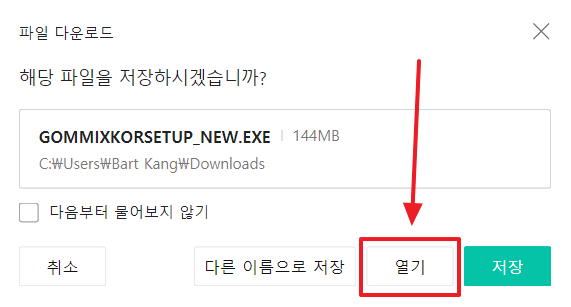 ✅ 그럼 아래와 같이 파일 다운로드 안내창이 뜨는데요! 아래 프로그램은 설치프로그램이니 열기를 눌러 바로 곰믹스 다운로드 설치가 진행될 수 있도록 합시다!😊