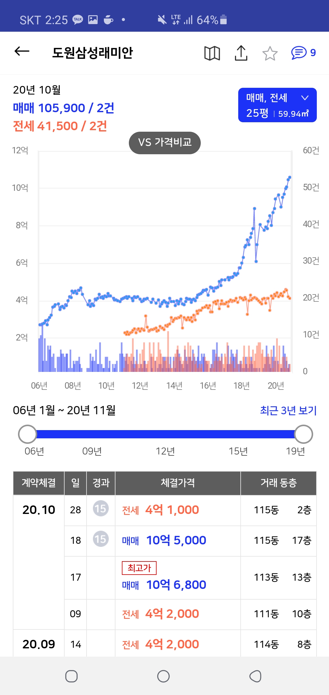 4. 그러면 해당 물건의 시세 변동과 거래 내역등을 확인할 수 있습니다.