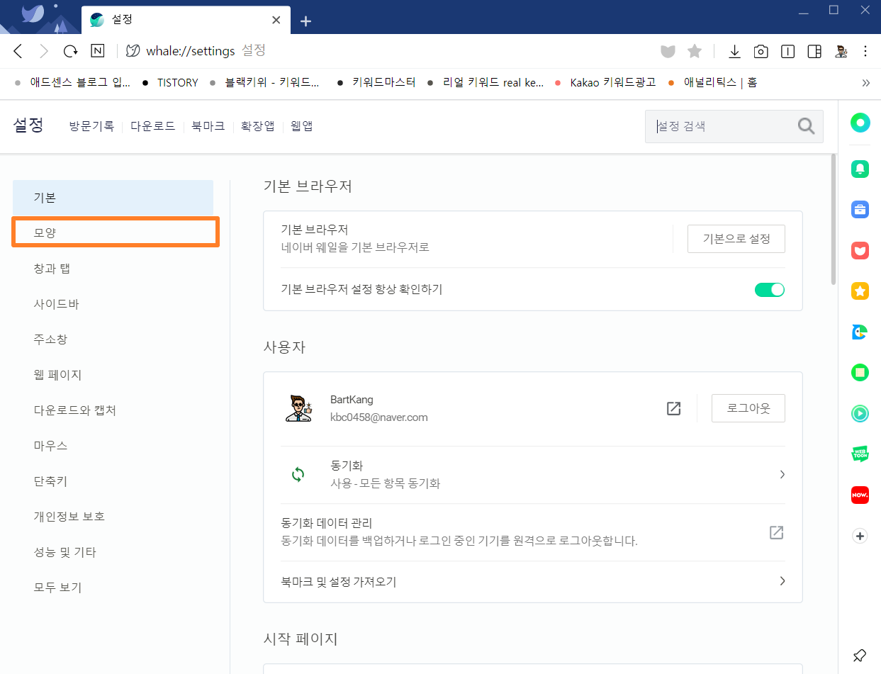 우측 상단 메뉴탭에서 점 세개 클릭 👉 설정 👉 모양