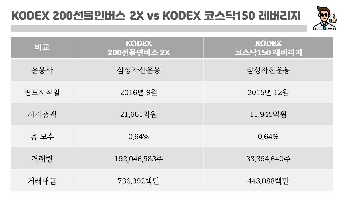 둘다 거래량, 거래대금이 어마무시합니다 ㄷㄷㄷ 시총에 있어서는 KODEX 200선물인버스2X가 2배정도 되는 것으로 보이는데요! 이 둘의 인기가 얼마나 되는지가 바로 실감이 됩니다.🙂