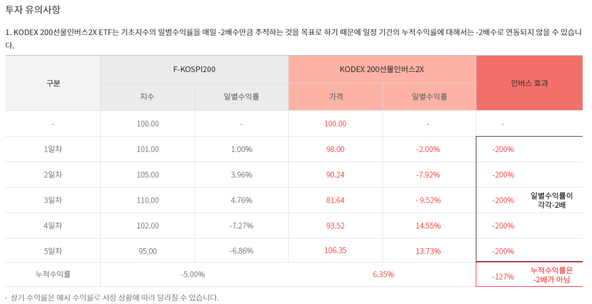 먼저, KODEX 200선물인버스2X ETF는 기초 지수의 일별 수익률을 일단위 -2배만큼 추종하는 것을 목표로 하기에, 일정기간(예를들면 일주일 혹은 한달)의 누적 수익률은 -2배가 되지 않을 수 있습니다.😏