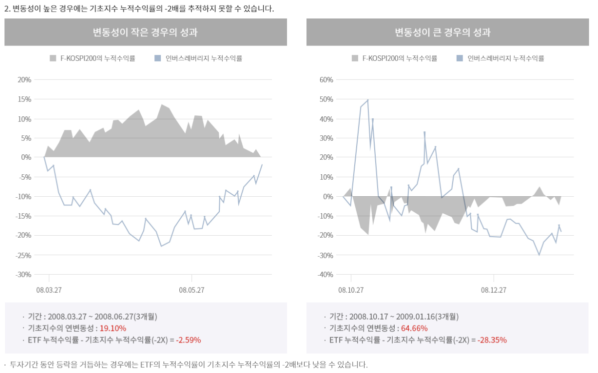 다음으로, 변동성이 큰 경우에 기초지수 누적수익률의 -2배를 따라가지 못할 수 있는데요!
