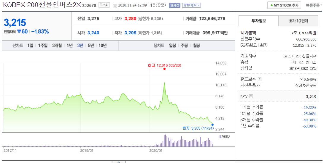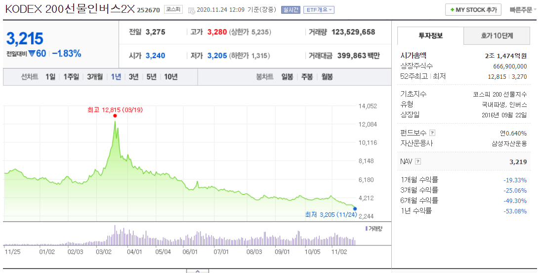 👉 2020/11/24 - KODEX 200선물인버스2X, 곱버스 수수료부터 차트까지 쉽게 비교분석☺