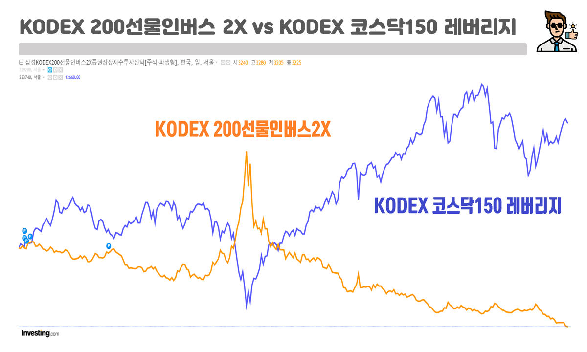 물론 KODEX는 코스닥150지수의 2배를 추종하는 ETF이고 KODEX 200선물인버스2X는 KOSPI200지수의 인버스 2배를 추종하는 ETF라 직접적인 비교가 다소 어색할 수 있지만, 그 추이 비교를 위해 둘을 나란히 두어보았는데요!😁