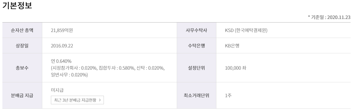 총 보수가 연 0.64%로 일반적인 ETF가 보통 0.15%정도로 형성이 되어 있는 것을 생각해보았을 때, 꽤나 그 보수가 비쌈을 알 수 있어요!☝