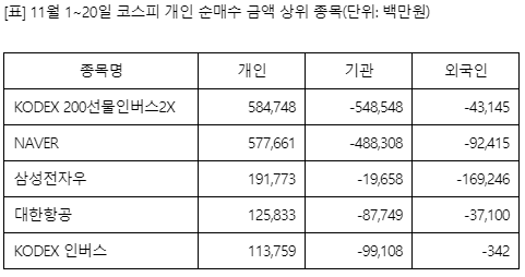 심지어 요즘 핫하다고 하는 삼성전자우 혹은 네이버보다 개인 순매수금액이 훨씬 웃도는 것으로 보이는데요! 인버스에 거는 베팅 ETF이니만큼 개미분들의 순정이 무참히 짖밟히지는 않을까 걱정도 됩니다.😅
