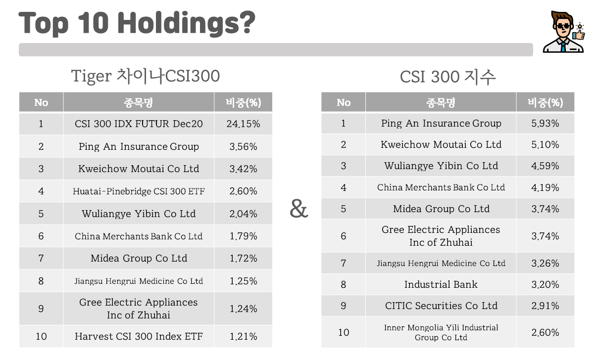 종목 구성을 살펴보면 종목을 구성하는 순위가 다소 다른 것을 확인할 수 있는데요! Tiger 차이나CSI300에서 CSI300지수를 추종하되 구성비중을 소폭 달리 설정하여 지수 변동 추이는 따라가되 수익률을 높이고자 한 것으로 보입니다.🤗