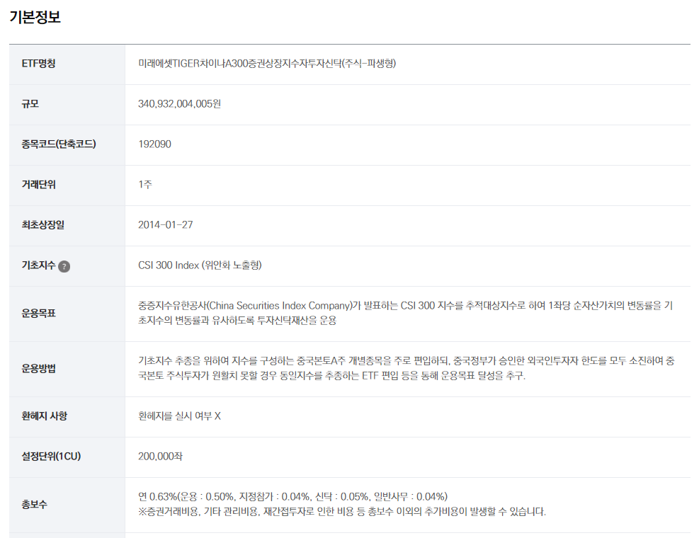 기본적인 Tiger 차이나CSI300 ETF에 대한 정보들 한번 아래 표와 함께 살펴보도록 하겠습니다.