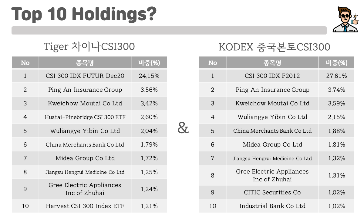 사실 이 둘의 구성종목 자체로만 두고 보면 거진 비슷한 기업들로 ETF가 구성되어 있는 것을 알 수 있는데요! 다만 앞서 CSI300과 Tiger 차이나CSI300의 구성 순위가 달랐던 것처럼, 아무래도 KODEX 중국본토CSI300도 Tiger 차이나CSI300과는 조금 다른 구성 비중으로 차별화를 두고 있는 것을 알 수 있습니다.