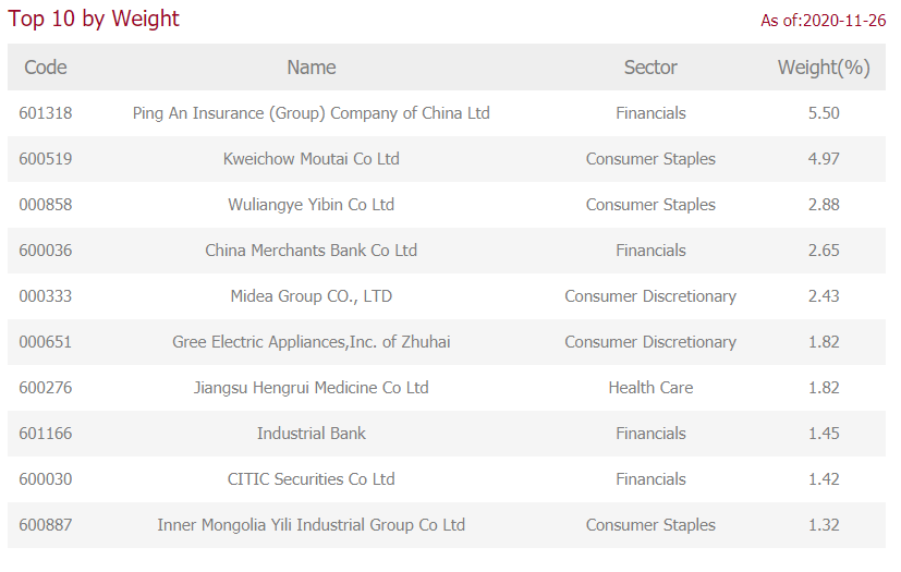 CSI300을 이루는 주요 산업군으로는 금융분야가 가장 큰 것을 알 수 있구요! 그다음 주요 소비재, 에너지 산업군 순으로 구성되어 있으며 구체적인 개별 종목은 아래와 같습니다.👇