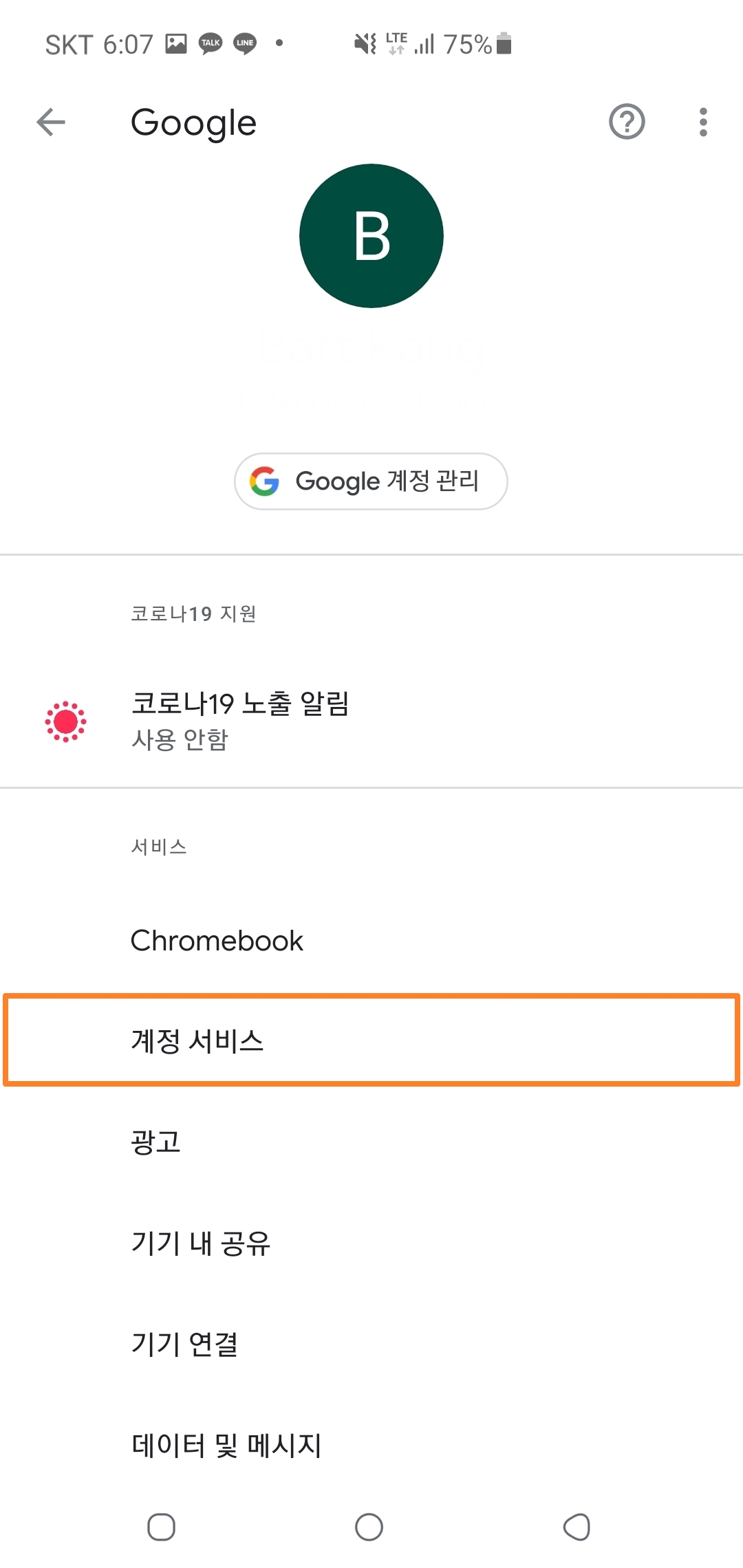 3. 다음으로 메뉴들 중에 '계정 서비스'라는 친구를 클릭해주시구요!