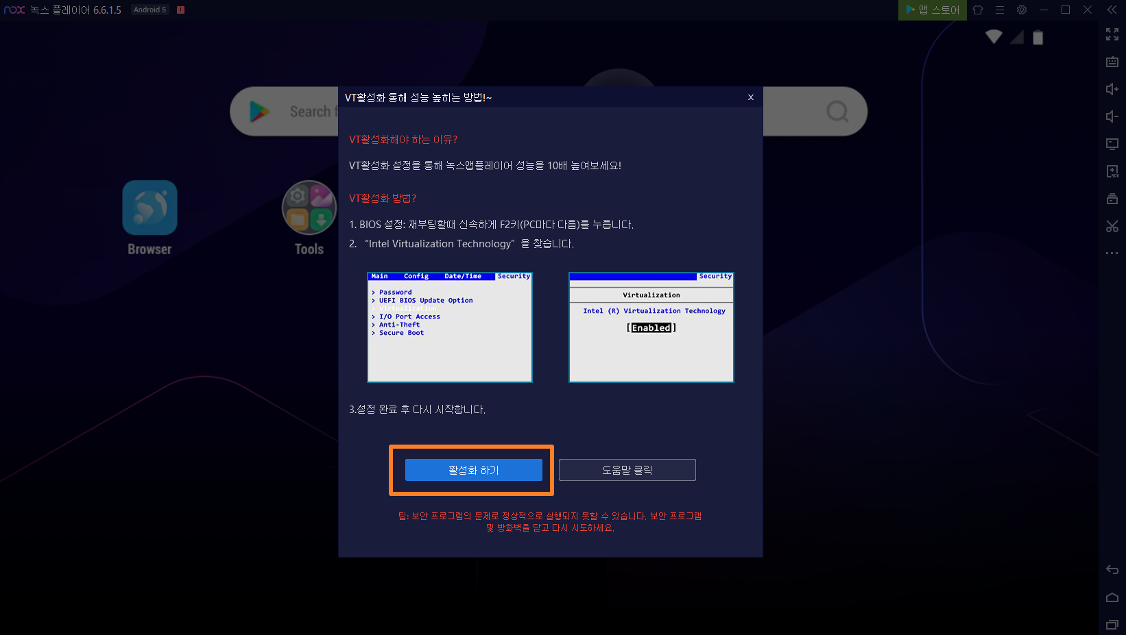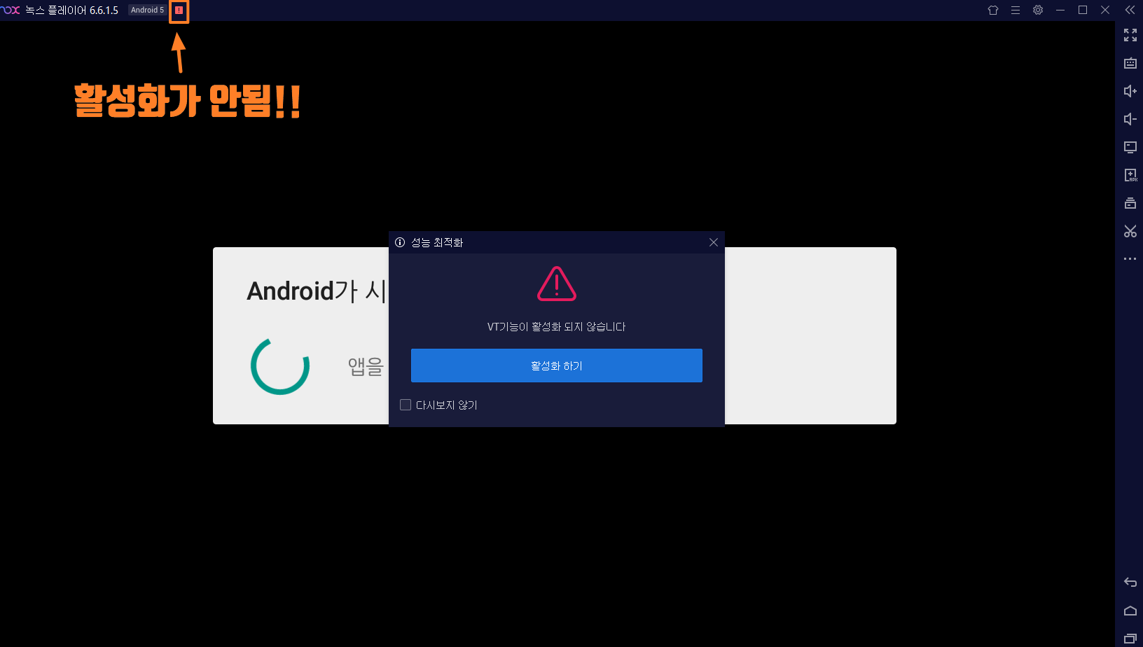 6. 그 다음 녹스 플레이어를 실행시켜주시면, 정상적으로 활성화가 되어 있는 것을 알 수 있습니다!