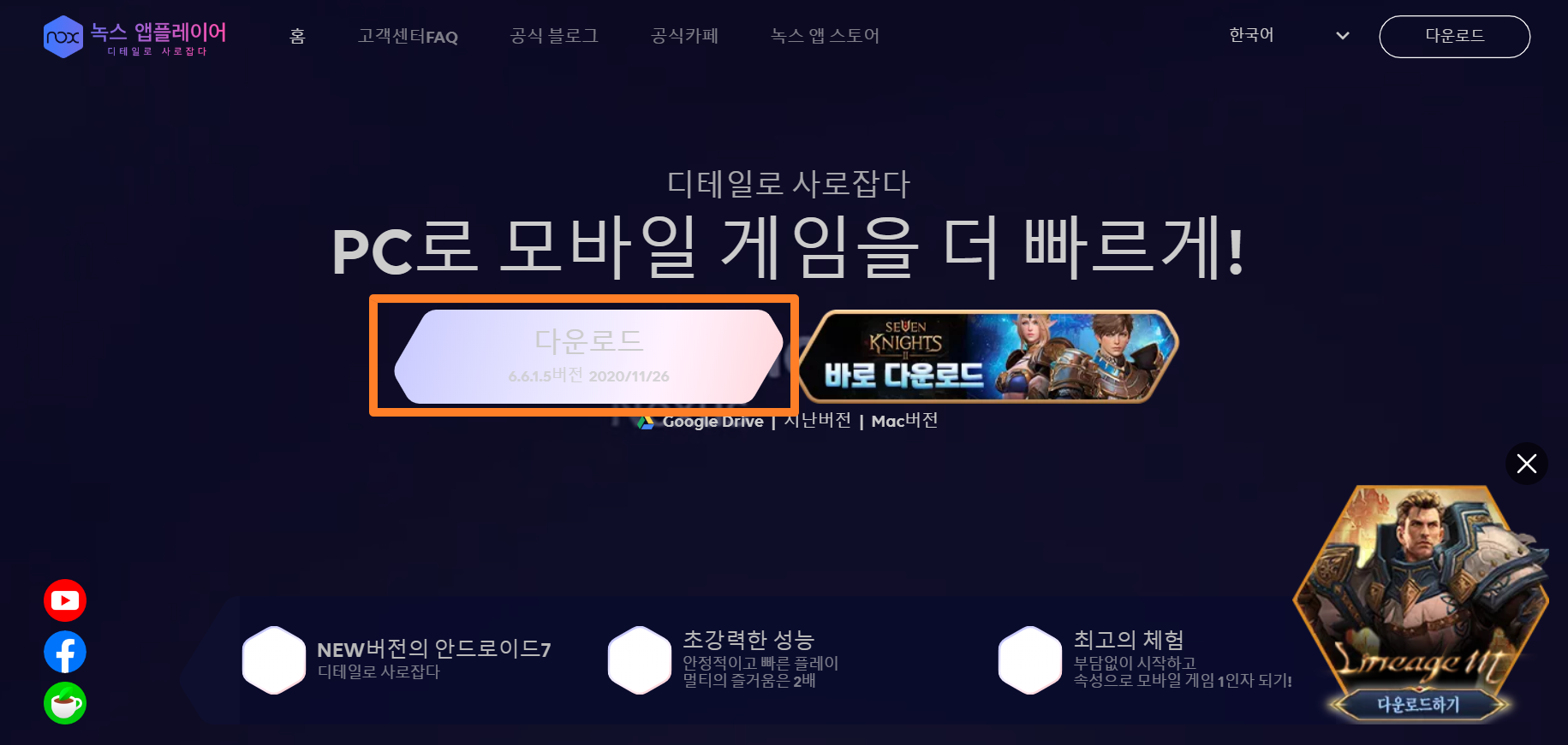 1. 녹스 앱플레이어 홈페이지에서 다운로드 클릭!☝