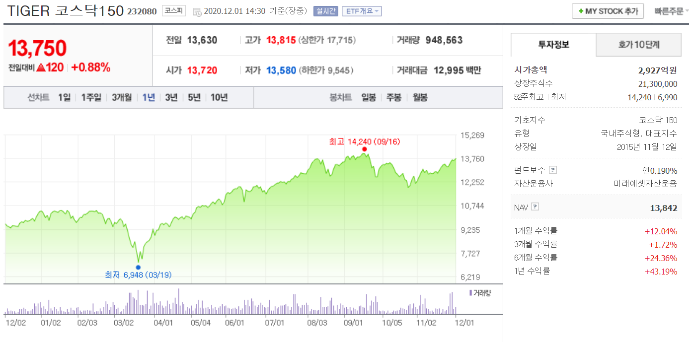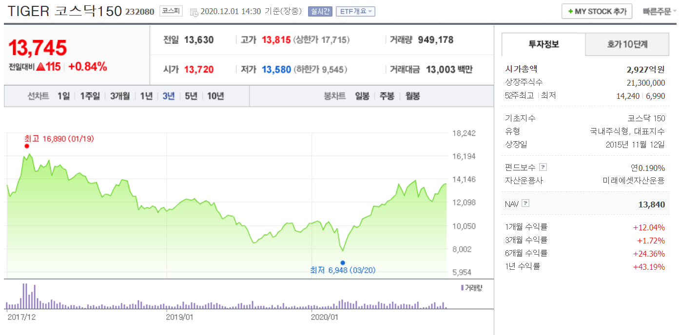 왼쪽이 1년 & 오른쪽이 3년단위 ETF의 주가변동 그래프인데요! 2018년도에 비해 2020년 현재는 타이거 코스닥150의 주가가 아직까지는 회복하지 못하고 있음을 알 수 있습니다. 그러나, 그만큼 성장 가능성을 기대해보아도 되지 않을까 하는 생각입니다.😀