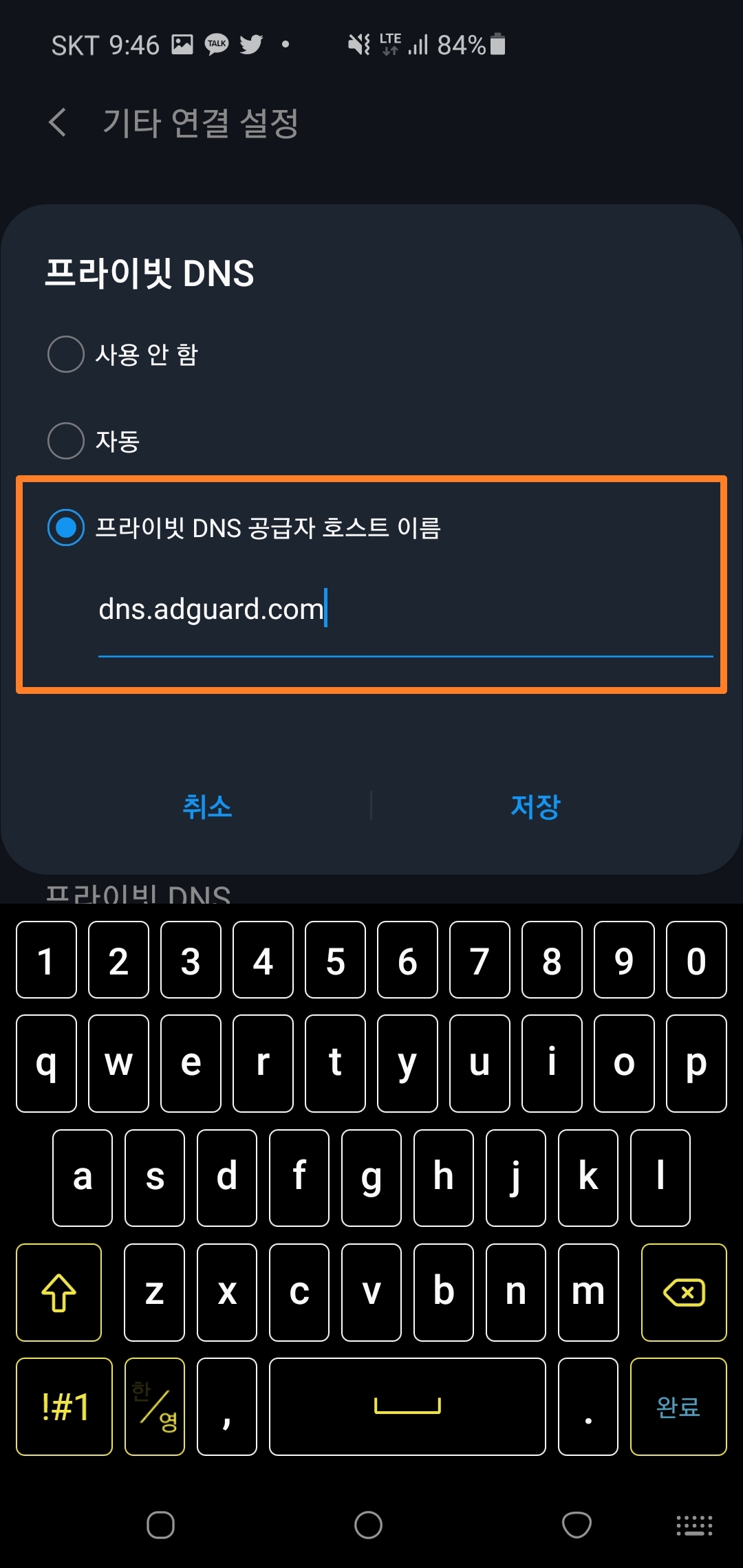 4. 프라이빗 DNS 공급자 호스트 이름 - dns.adguard.com 입력