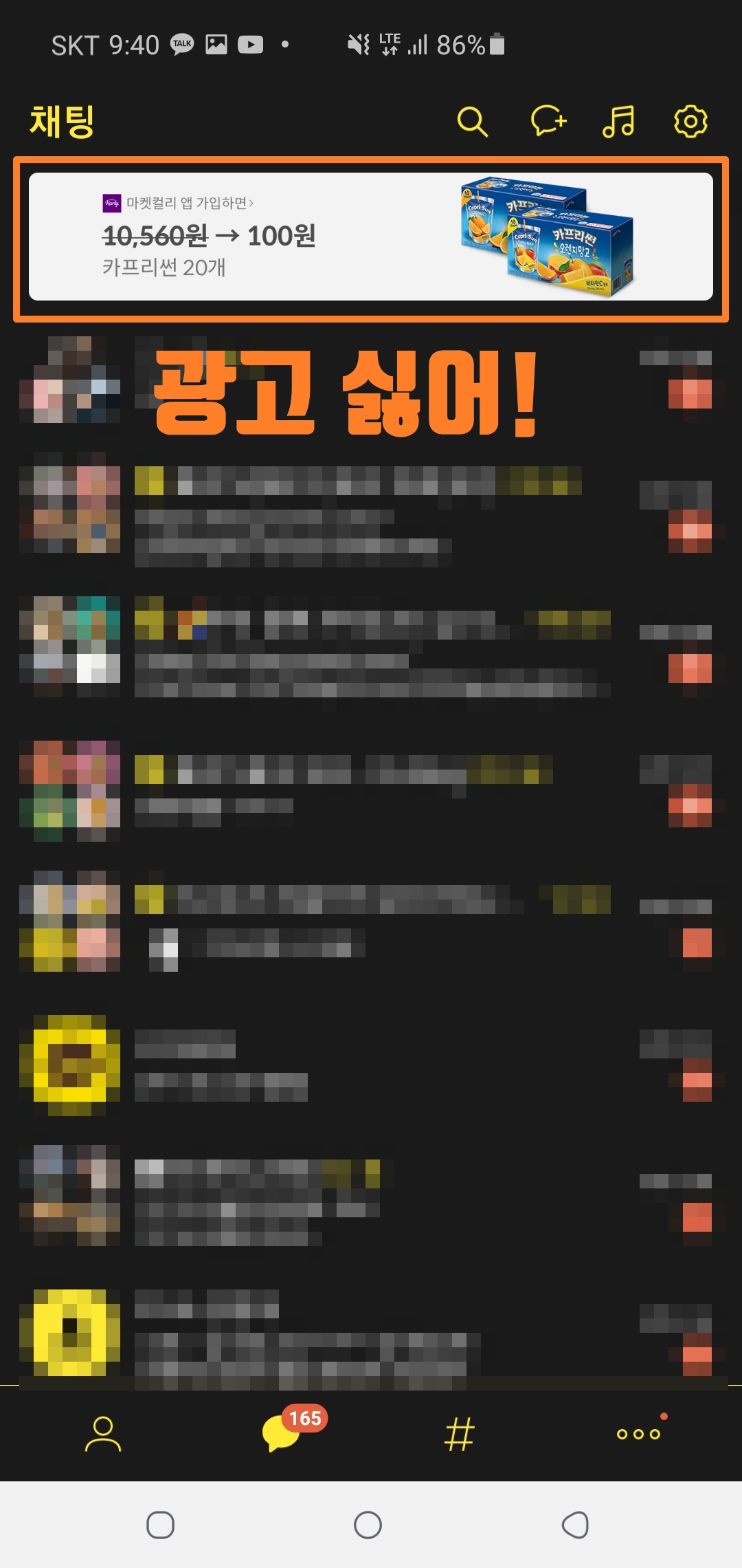먼저, 카톡 광고 차단 방법 채팅편입니다! 여러분들 채팅에 보시면 아래 사진처럼 상단에 광고가 나타나있는 것을 알 수 있는데요!😕