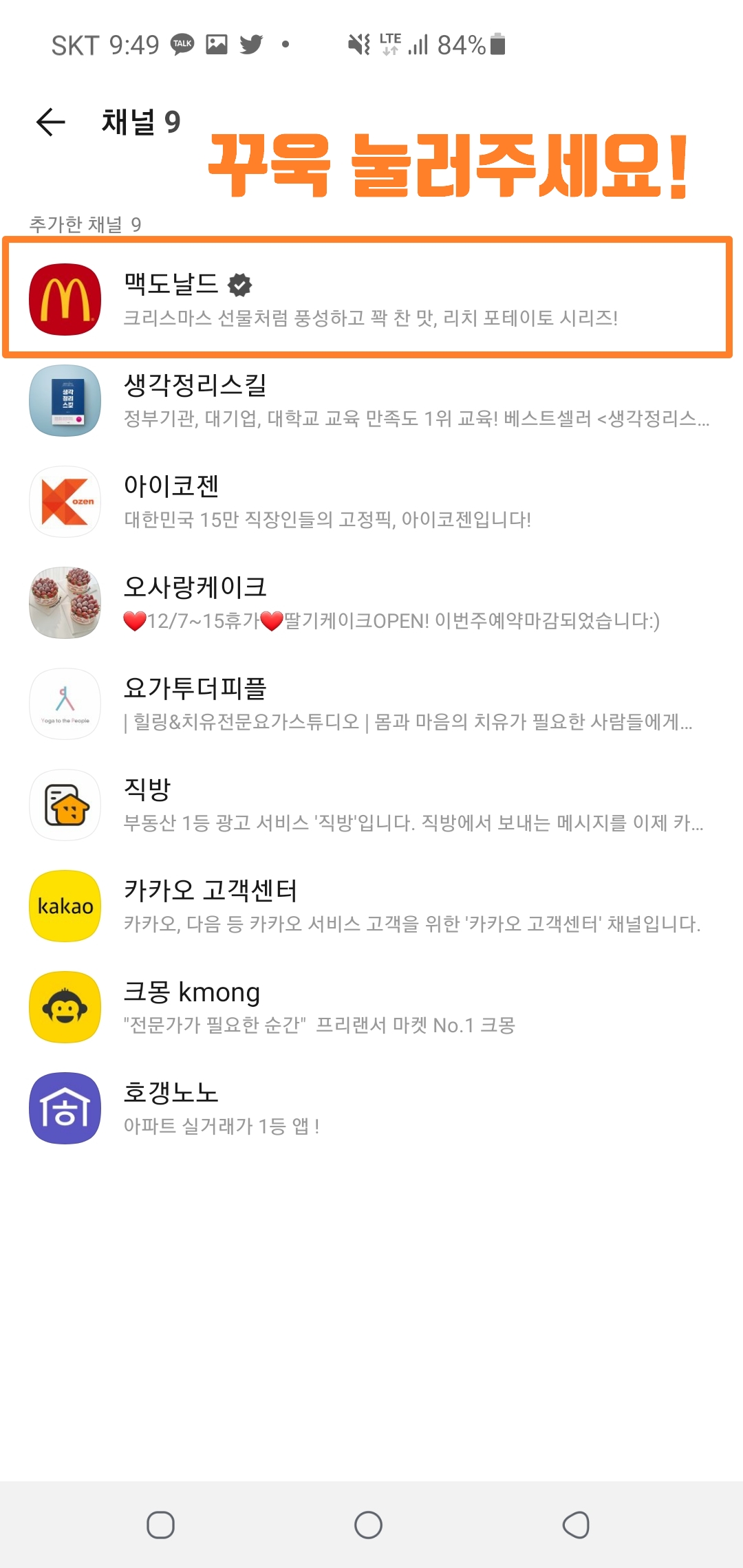 1. 카톡에서 채널 클릭 - 플러스 친구 꾸욱 눌러주세요!