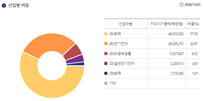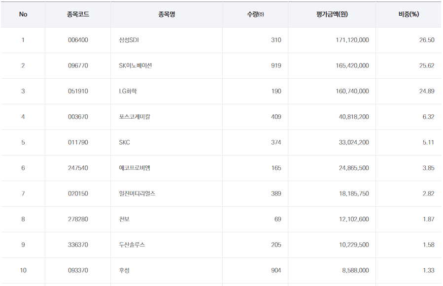 사실 산업별 비중을 비교하는 것 자체가 큰 의미가 없는 것이 대부분이 2차전지 산업군과 관련된 기업이기에 큰 틀로 보면 모두 2차전지 기업들이다라고 생각하시면 됩니다. 기업 비중을 살펴보시면 바로 아실 수 있는 내용이지요!