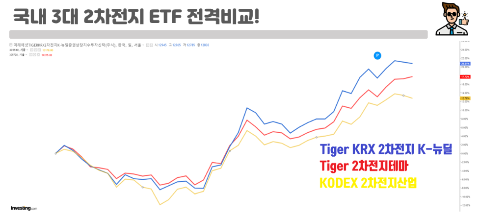 위 그래프를 보시면, Tiger KRX 2차전지 K-뉴딜이 출시 이후 현재는 가장 높은 수익률을 보여주고 있는데요! 그 뒤로 Tiger 2차전지테마, KODEX 2차전지산업 순으로 따라오고 있네요.