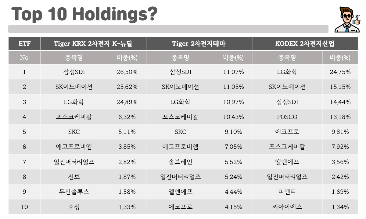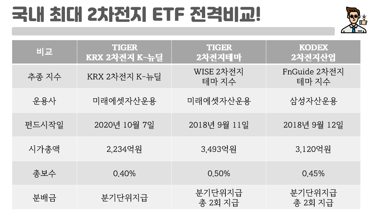 그렇다면, 국내 3대 2차전지 관련 ETF와 비교해보았을 때, Tiger KRX 2차전지 K-뉴딜은 어떤 차이가 있을까요?