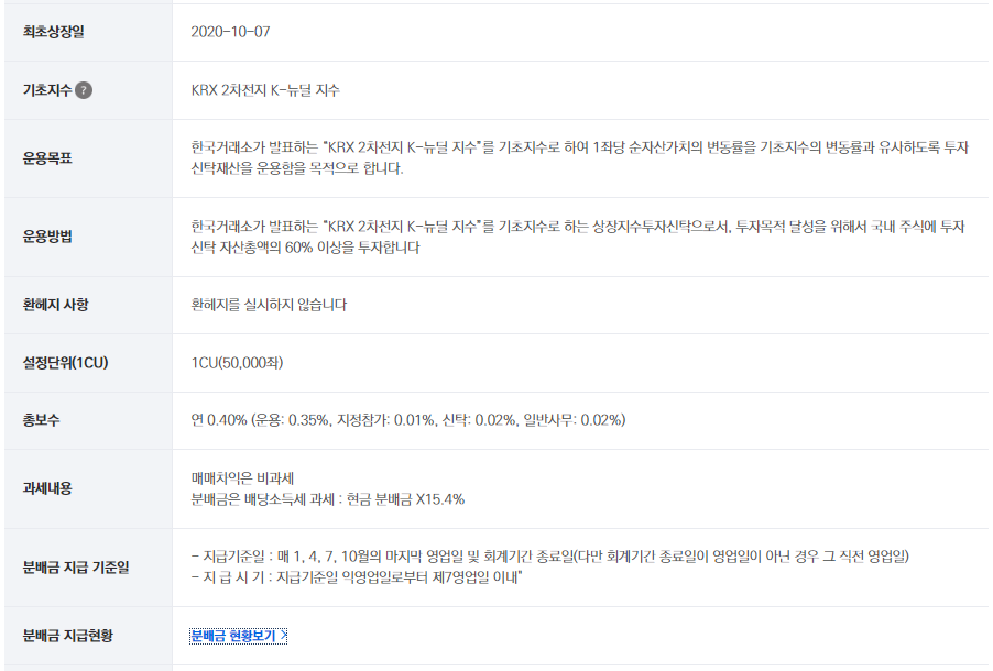 이외에 분배금의 경우에는 분기단위지급을 상품설명서에 명시하고 있지만, 실제로는 Tiger 2차전지테마, KODEX 2차전지산업 모두 2회밖에 지급이 안되었다는 것도 참고하시면 좋을 것 같습니다.😃