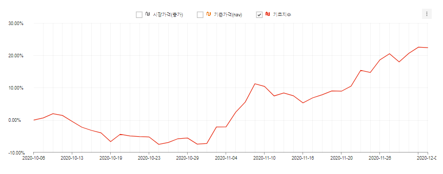 마찬가지로, 출시 직후에는 살짝 조정을 받았지만 1달여전부터 지속적으로 상승해온 것을 알 수 있습니다. 역시 지수따라 수익을 내주고 있군요!👏